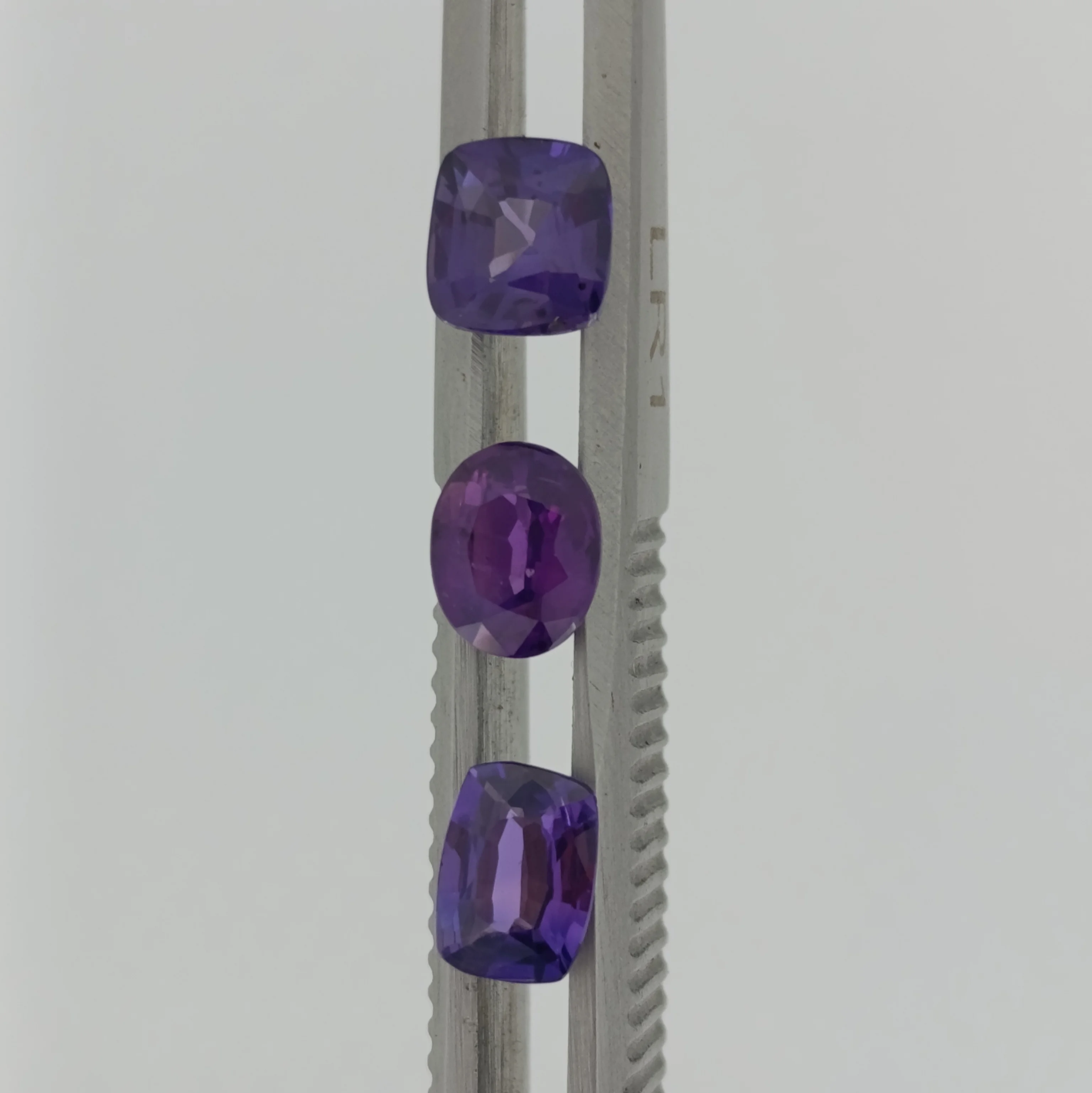 Natural Violet Sapphire Gem No. – 900250034 Color – Violet Weight – 2.55 Carat (3 Pieces) Shape – oval, cushion, rectangle cushion Origin - Ceylon Measurements – N/A Identification – Natural Corundum Sapphire Enhancement – Unheated Clarity Information – Top eye clean
